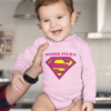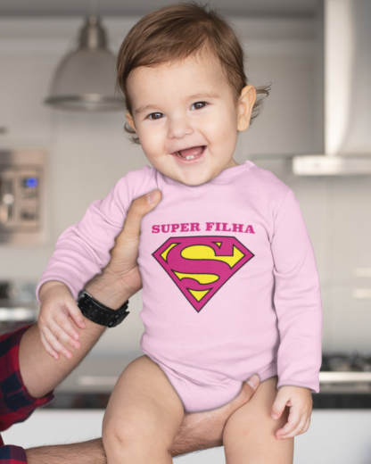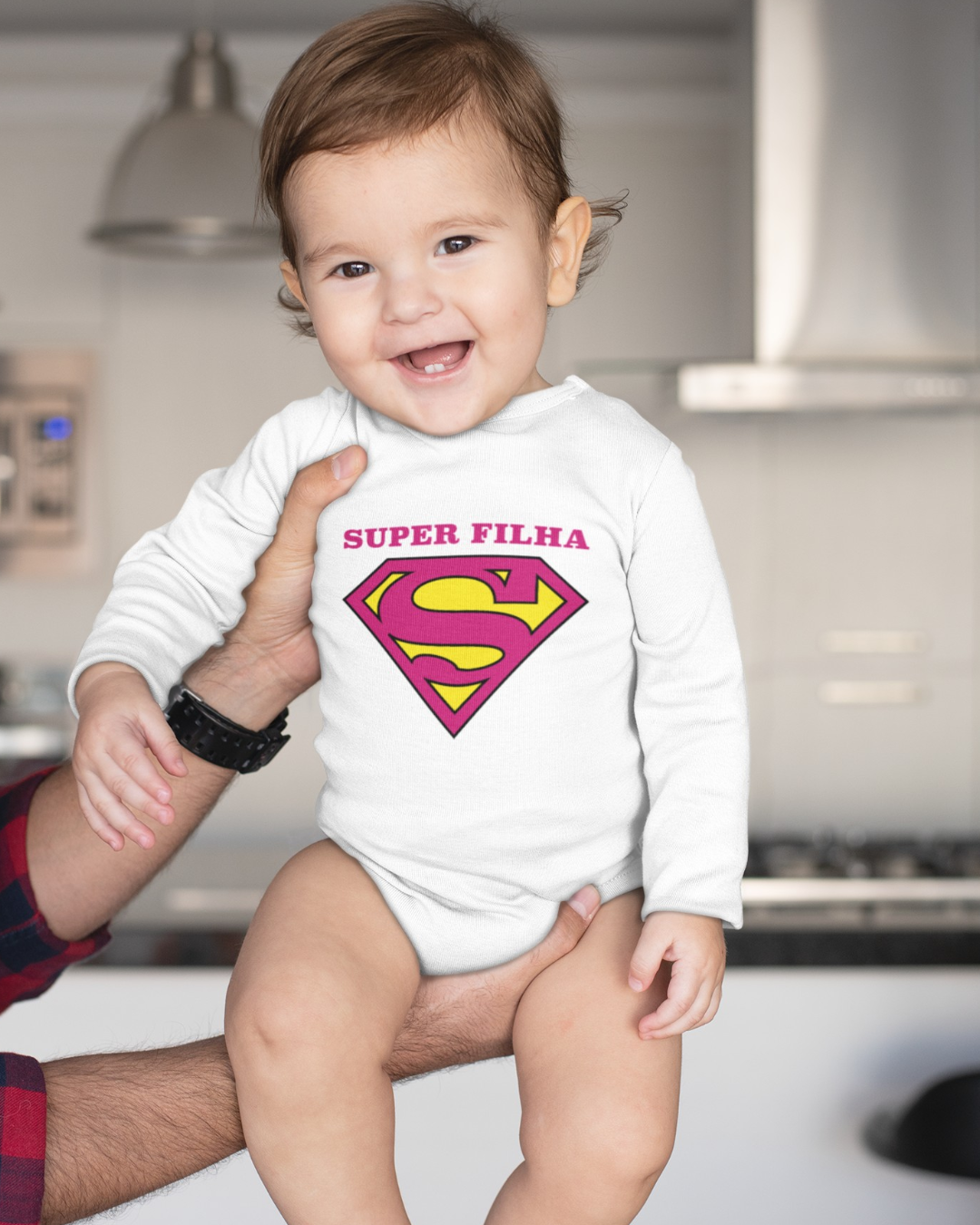 Body de manga comprida para bebé, confortável e suave ao toque, perfeito para celebrar um momento muito especial: O Dia da Mãe, Dia do Pai, Dia dos Filhos, Natal ou outras datas festivas. Com a frase cheia de amor e carinho “Super Filha”, baseado num dos maiores filmes de super heróis “Super Homem”, este body é ideal para tornar esta data ainda mais memorável. Perfeito para usar na celebração do Dia da Mãe em sessões de fotos ou simplesmente para guardar como recordação deste primeiro momento tão especial.