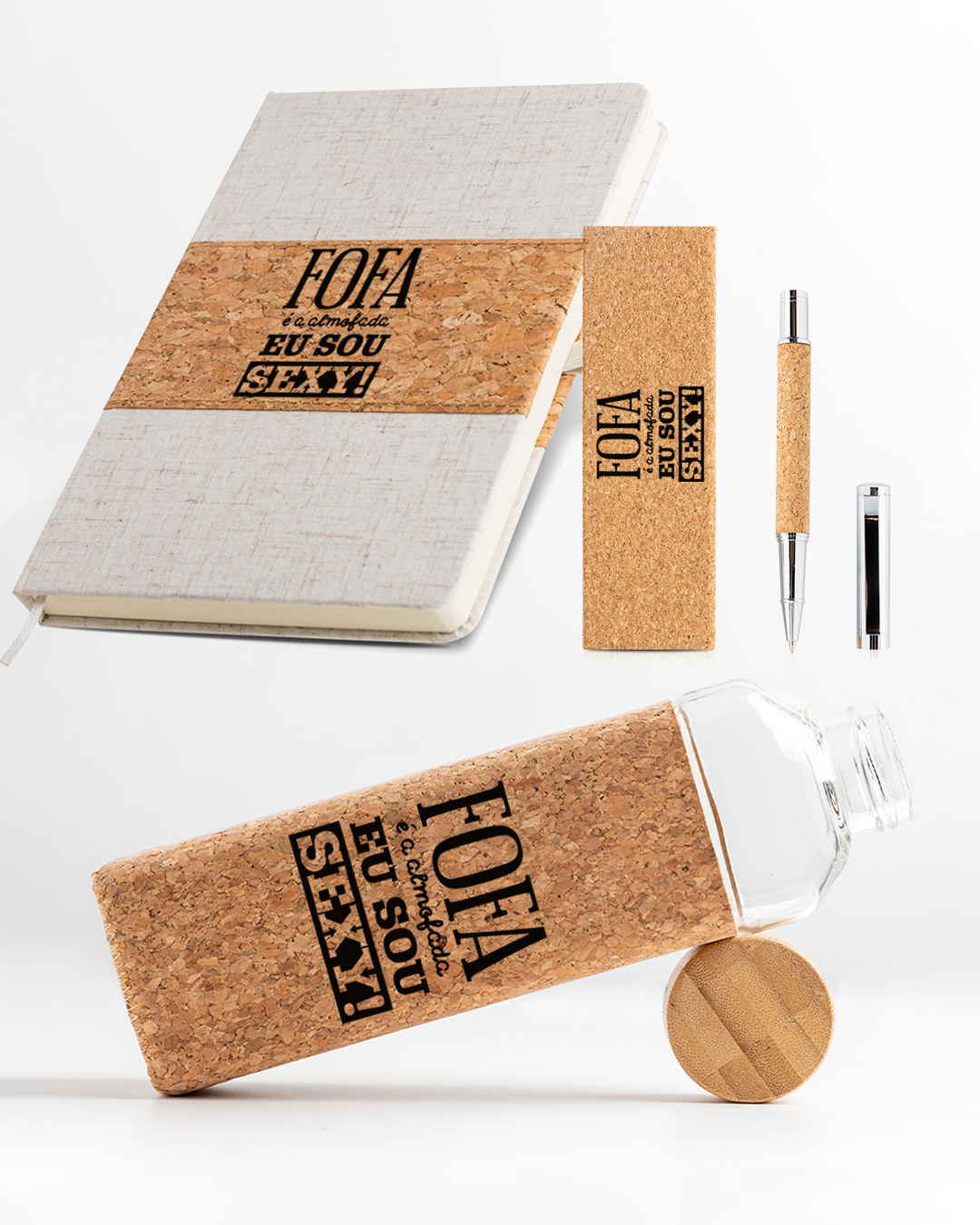 Conjunto Cortiça (Caderno, Esferográfica e garrafa de vidro) “Fofa é a Almofada”