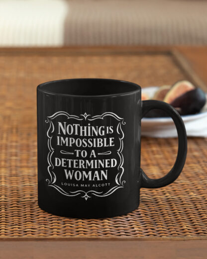 Apresentamos a elegante caneca preta em cerâmica, além de ser visualmente atraente, é resistente e ideal para uso diário, seja em casa, no escritório ou como um presente simbólico para alguém especial. Personalizada com o design minimalista, aliado à mensagem impactante de Louisa May Alcott: “Nothing is Impossible to a Determined Woman.”