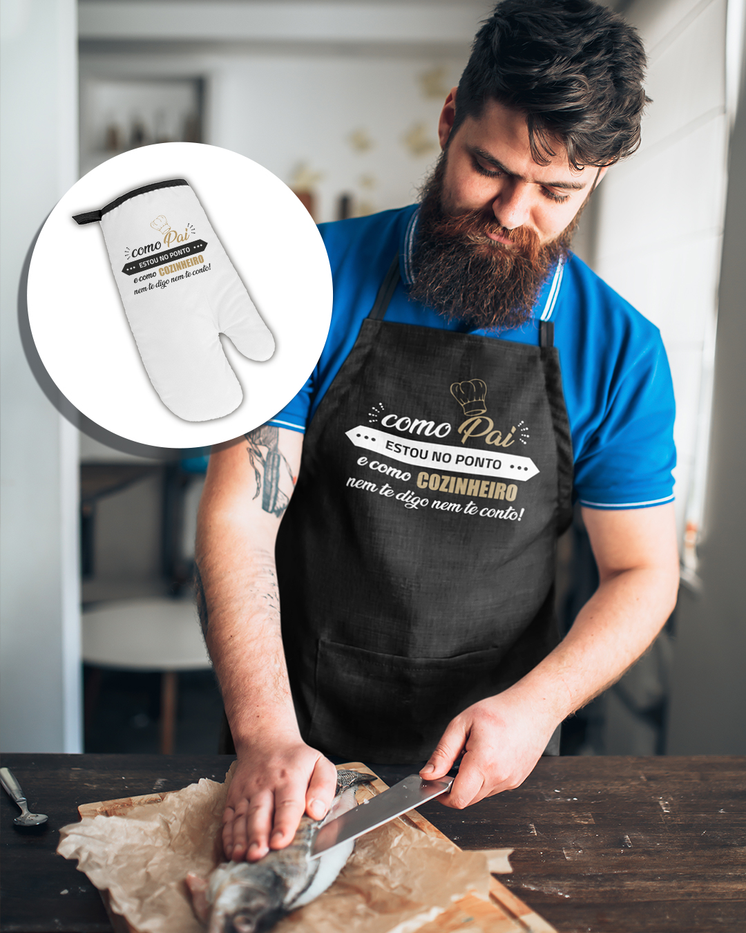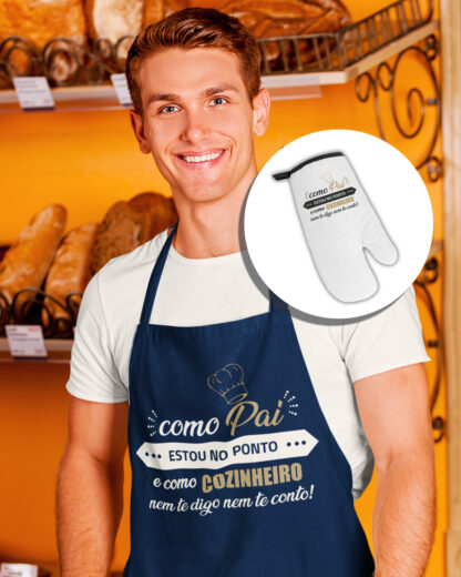 Como Pai estou no Ponto, e como cozinheiro nem te digo nem te conto – Conjunto Avental + Luva de Forno