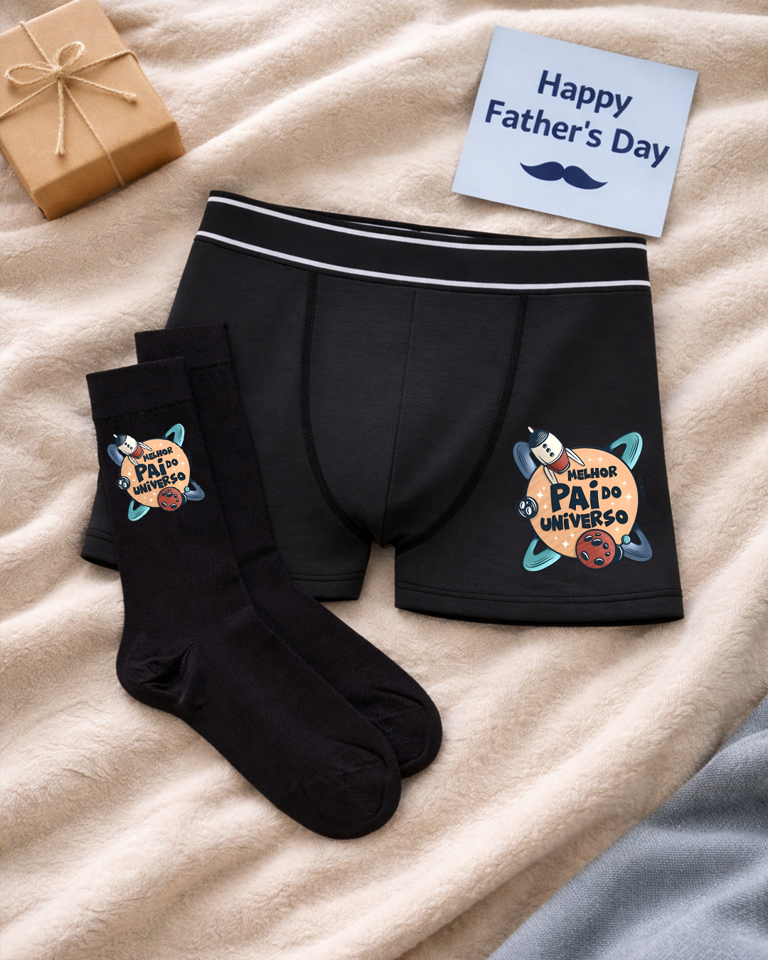 Surpreenda o seu Pai com um presente pensado exclusivamente para ele: um conjunto de boxers e meias personalizados.