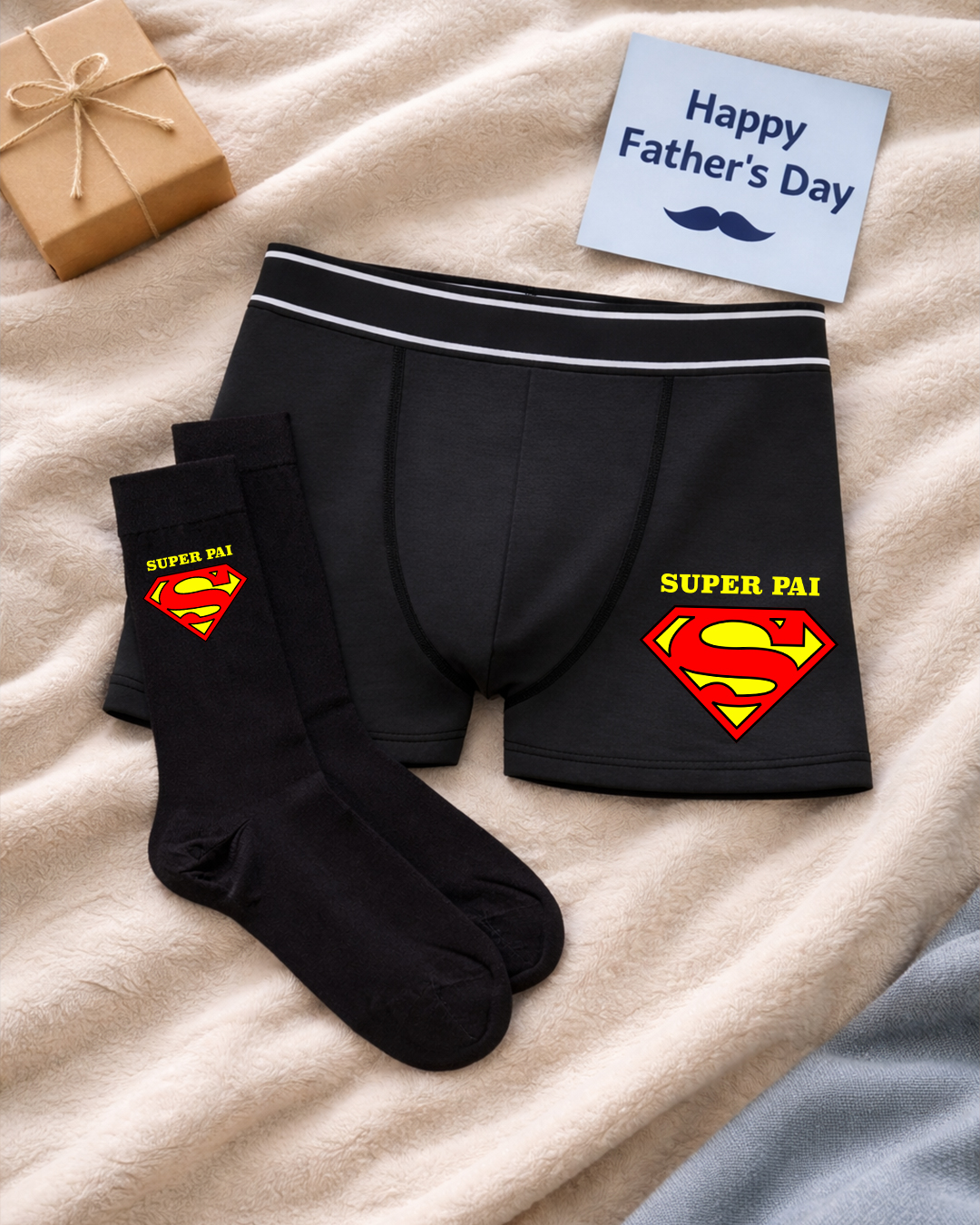 Surpreenda o seu Pai com um presente pensado exclusivamente para ele: um conjunto de boxers e meias personalizados.