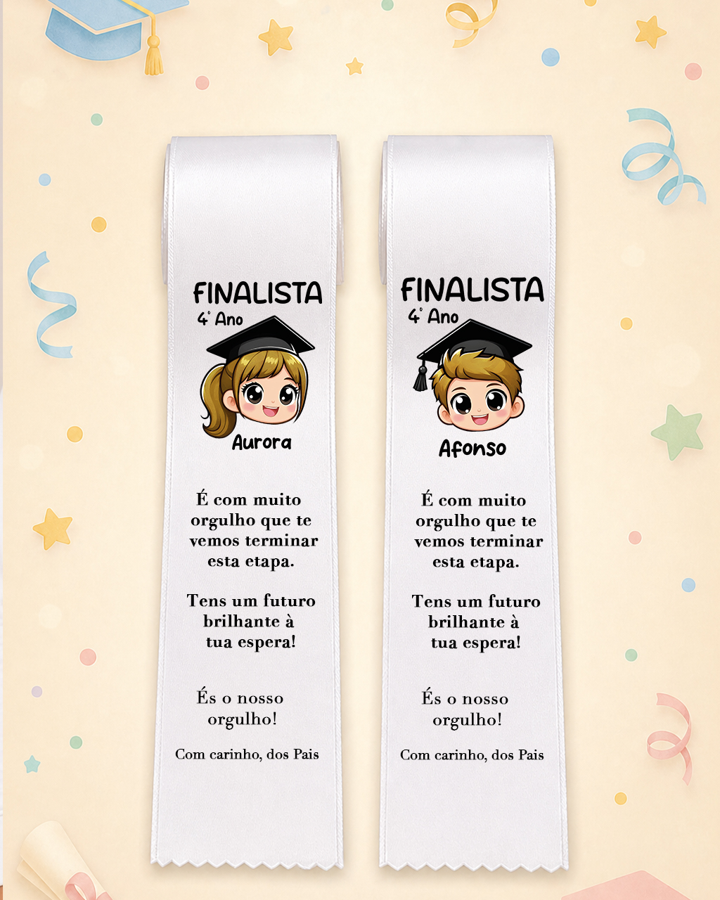 Comemore o seu marco especial com nossas fitas de cetim personalizadas para Finalistas. Este produto apresenta um design exclusivo com desenhos de cartola em rosa ou azul, acompanhados do ano e texto “FINALISTA 4º Ano”, garantindo que cada detalhe reflita o seu momento único. Feitas com material de alta qualidade, as nossas fitas de cetim oferecem um acabamento brilhante e duradouro. Os detalhes nítidos e elegantes do design garantem que sua fita se destaque em qualquer celebração ou evento especial. Além do design padrão, as fitas podem ser ajustadas para atender às suas preferências individuais, proporcionando um toque pessoal e significativo. Elas são perfeitas para finalistas que desejam destacar sua conquista com estilo. Sejam para Finalistas de ensino Pré-escolar, Primário, Básico, Secundário como para Universitários.