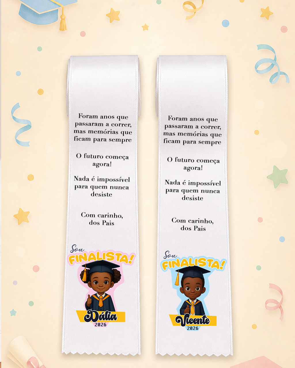 Comemore o seu marco especial com nossas fitas de cetim personalizadas para Finalistas. Este produto apresenta um design exclusivo com desenhos de cartola em rosa ou azul, acompanhados do ano e texto “Sou Finalista…”, garantindo que cada detalhe reflita o seu momento único. Feitas com material de alta qualidade, as nossas fitas de cetim oferecem um acabamento brilhante e duradouro. Os detalhes nítidos e elegantes do design garantem que sua fita se destaque em qualquer celebração ou evento especial. Além do design padrão, as fitas podem ser ajustadas para atender às suas preferências individuais, proporcionando um toque pessoal e significativo. Elas são perfeitas para finalistas que desejam destacar sua conquista com estilo. Sejam para Finalistas de ensino Pré-escolar, Primário, Básico, Secundário como para Universitários.