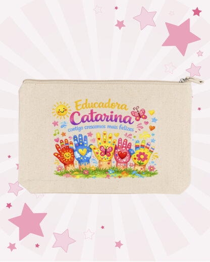Surpreenda a sua Professora, Educadora ou Auxiliar com um necessaire personalizado “Educadora… contigo crescemos felizes” e único para uso diário. Necessaire 100% algodão com bolsa interior, cujas dimensões são 28x20x4cm. Este necessaire foi concebido para atender a todas as suas necessidades, oferecendo um espaço amplo e durabilidade. Ideal para oferecer como presente ou lembrança de Final de Ano Letivo, Natal, Páscoa ou outras datas especiais.