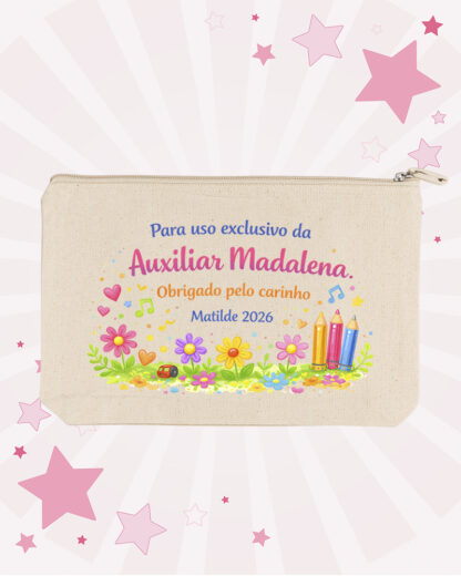 Surpreenda a sua Professora, Educadora ou Auxiliar com um necessaire personalizado “Para Uso exclusivo da Auxiliar…” e único para uso diário. Necessaire 100% algodão com bolsa interior, cujas dimensões são 28x20x4cm. Este necessaire foi concebido para atender a todas as suas necessidades, oferecendo um espaço amplo e durabilidade. Ideal para oferecer como presente ou lembrança de Final de Ano Letivo, Natal, Páscoa ou outras datas especiais.