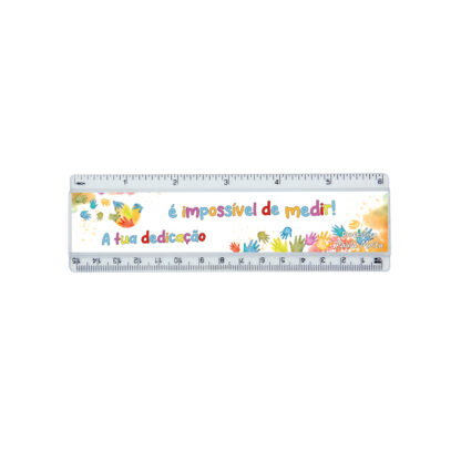 A régua de plástico personalizada de 15 cm de comprimento é o presente ideal para oferecer às crianças no infantário ou ensino primário. Com um design funcional e versátil e com a frase “A tua dedicação é impossível de medir”, é perfeita para acompanhar os pequenos nas suas atividades escolares. Seja para celebrar o final do ano letivo, Natal, Páscoa, aniversários ou outros eventos festivos, esta régua torna-se um presente significativo e útil. Personalize com o nome da professora, educadora ou auxiliar, adicionando um toque único e especial. Fabricada com plástico resistente, esta régua alia praticidade e durabilidade, sendo uma ferramenta inestimável para o dia a dia escolar. A sua personalização transforma um item simples em um presente cheio de significado.