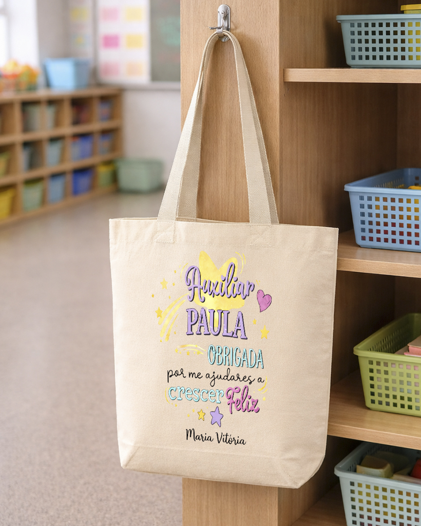 E porque cada etapa merece ser celebrada, as tote bags em algodão crú, personalizadas com a frase “Auxiliar… Obrigado por me ajudares a crescer feliz!“, para os Professores de Finalistas são ideais para as festas de final de ano, lembranças de Natal ou de Páscoa, tanto para Professores, Educadores, Auxiliares de ensino Pré-Escolar como de ensino Primário, personalizadas com desenho de professor e crianças. Um dos momentos mais ternurentos da Infância devem ser celebrados, de forma a mais tarde serem lembranças de um futuro adulto feliz.