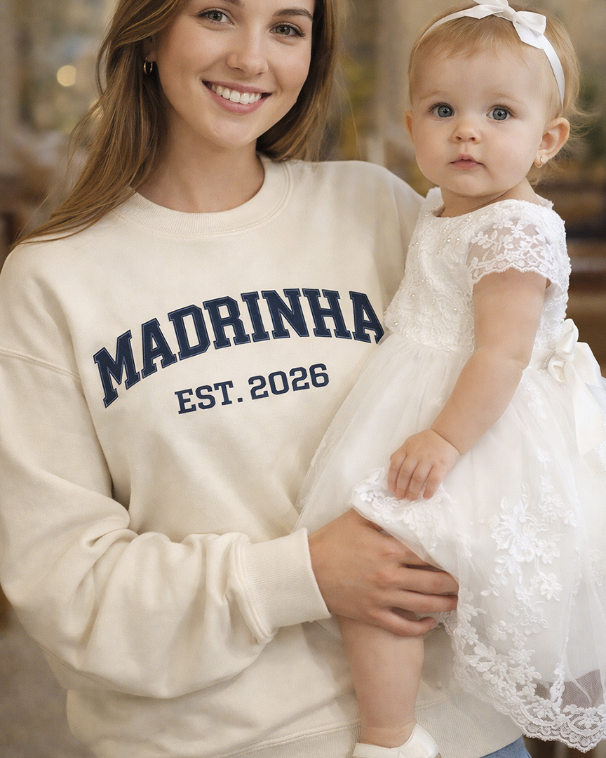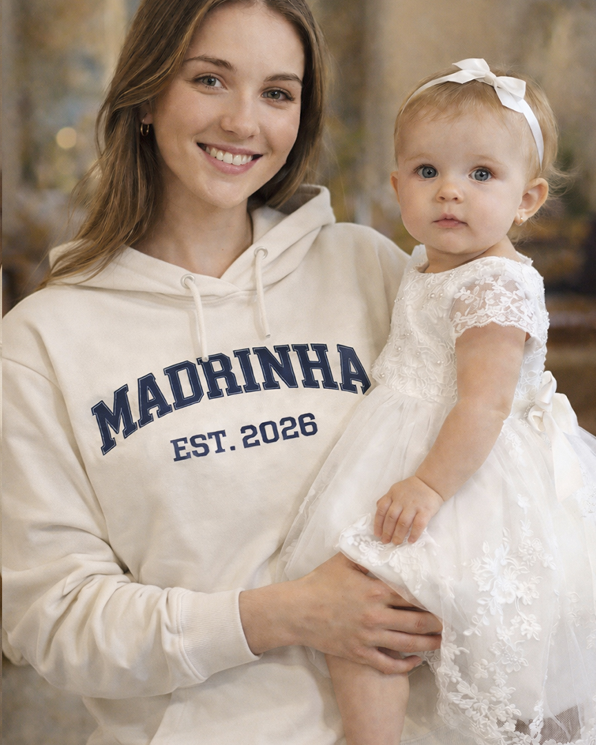 A Sweat e Hoodie personalizada “MADRINHA Est. …” em tom creme são a escolha perfeita para celebrar momentos especiais como a Páscoa e o Dia de Ramos com estilo e significado. Com um design inspirado nas clássicas letras universitárias, esta peça combina tradição e tendência, tornando-se um símbolo único de carinho entre padrinhos e afilhados. Confeccionadas com materiais de alta qualidade, oferecem conforto, suavidade e um ajuste ideal para o dia-a-dia. Perfeita para oferecer como presente simbólico nestas ocasiões tão importantes, esta sweat e hoodie são mais do que uma peça de roupa, é uma recordação afetiva que perdura no tempo.