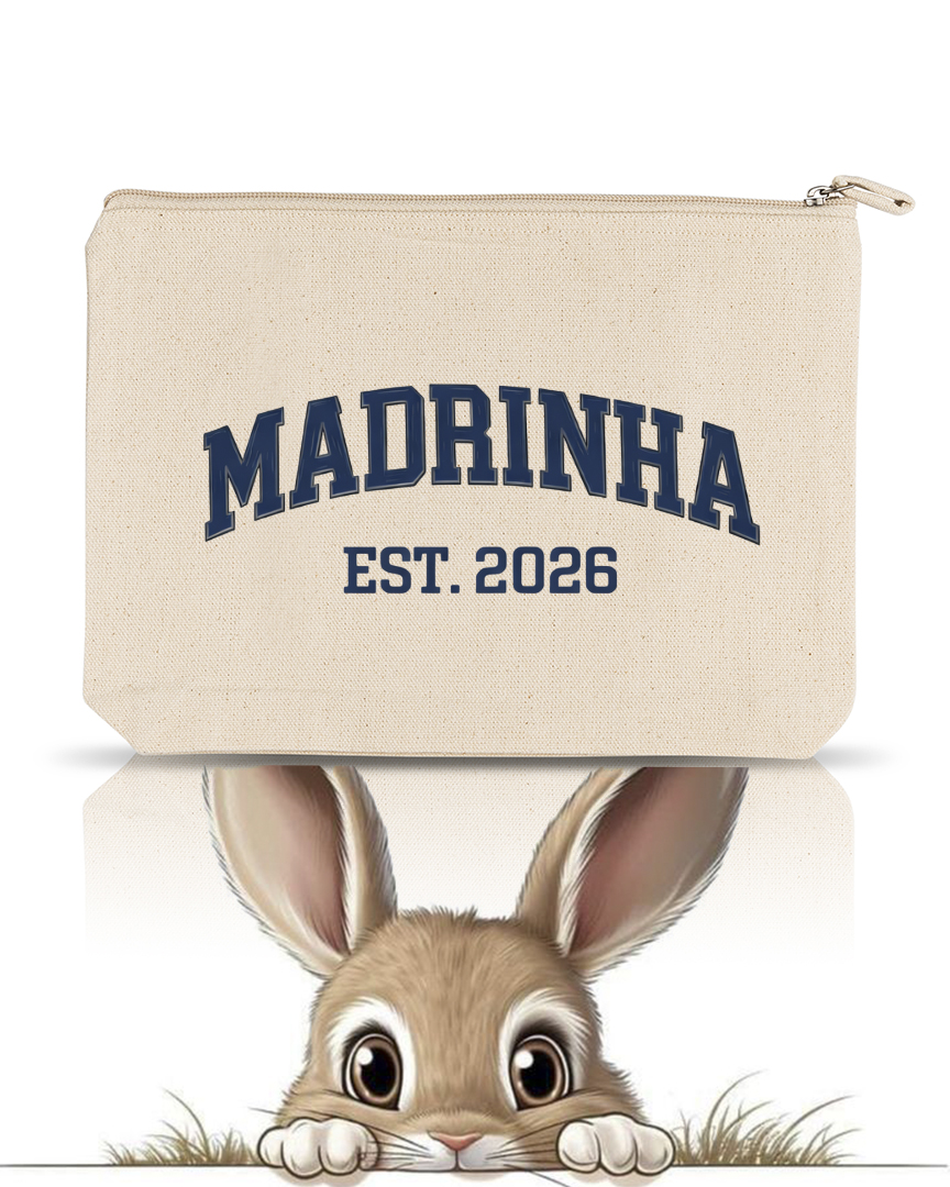 Surpreenda a sua Madrinha com um necessaire personalizado “MADRINHA EST.” e único para uso diário, no qual o design é baseado nas letras universitárias. Necessaire 100% algodão com bolsa interior, cujas dimensões são 28x20x4cm. Este necessaire foi concebido para atender a todas as suas necessidades, oferecendo um espaço amplo e durabilidade. Ideal para oferecer como presente ou lembrança de Páscoa, Domingo de Ramos, aniversários ou outras datas especiais.
