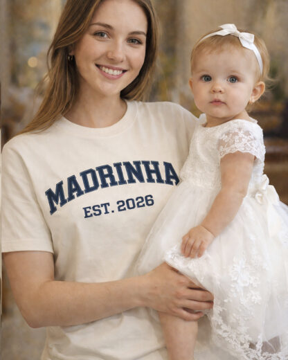 A t-shirt personalizada “MADRINHA EST. …” em tom creme é a escolha perfeita para celebrar momentos especiais como a Páscoa e o Dia de Ramos com estilo e significado. Com um design inspirado nas clássicas letras universitárias, esta peça combina tradição e tendência, tornando-se um símbolo único de carinho entre padrinhos e afilhados. Confeccionadas com materiais de alta qualidade, oferecem conforto, suavidade e um ajuste ideal para o dia-a-dia. Perfeita para oferecer como presente simbólico nestas ocasiões tão importantes, esta t-shirt é mais do que uma peça de roupa, é uma recordação afetiva que perdura no tempo.