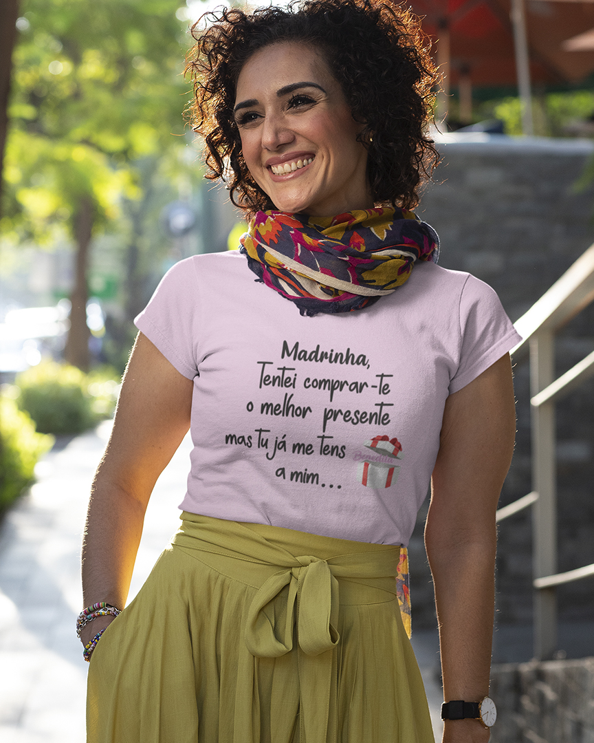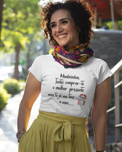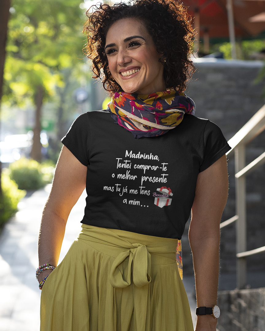 A t-shirt personalizada “Madrinha tentei comprar-te um presente mas já me tens a mim…” em branco, azul marinho e preto são a escolha perfeita para celebrar momentos especiais como a Páscoa, o Dia de Ramos e Aniversários com estilo e significado. Com um design inspirado num momento sem ideias para presentes, esta peça combina tradição com humor, tornando-se um símbolo único de carinho entre padrinhos e afilhados. Confeccionadas com materiais de alta qualidade, oferecem conforto, suavidade e um ajuste ideal para o dia-a-dia. Perfeita para oferecer como presente simbólico nestas ocasiões tão importantes, esta t-shirt é mais do que uma peça de roupa, é uma recordação afetiva que perdura no tempo.