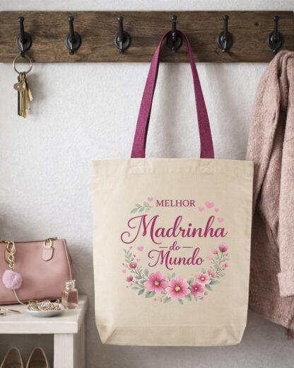 Surpreenda sua Madrinha com um presente personalizado que une elegância e significado. A nossa tote bag é 100% feita em algodão crú, resistente, garantindo um toque macio e durabilidade para o dia a dia.
